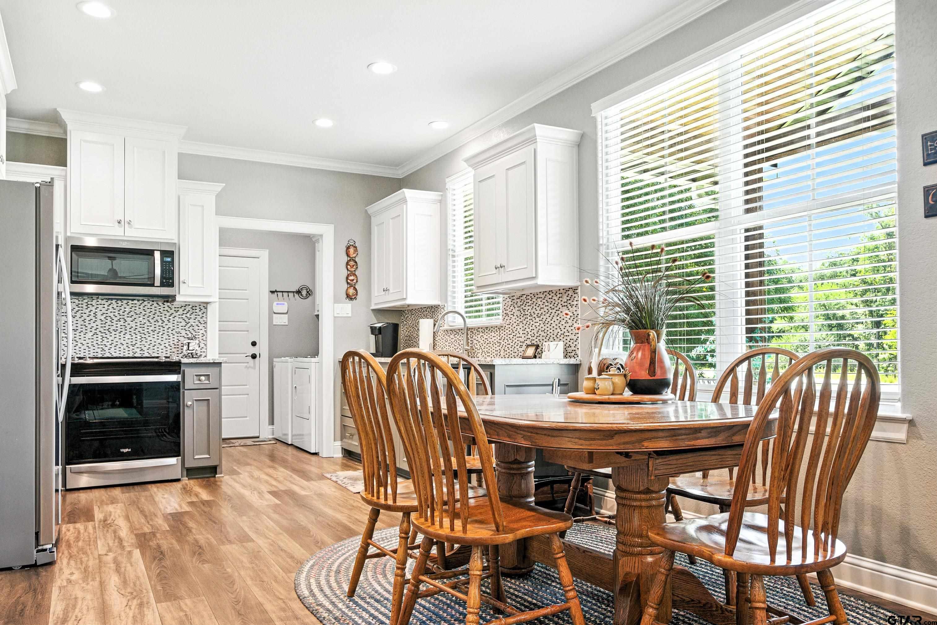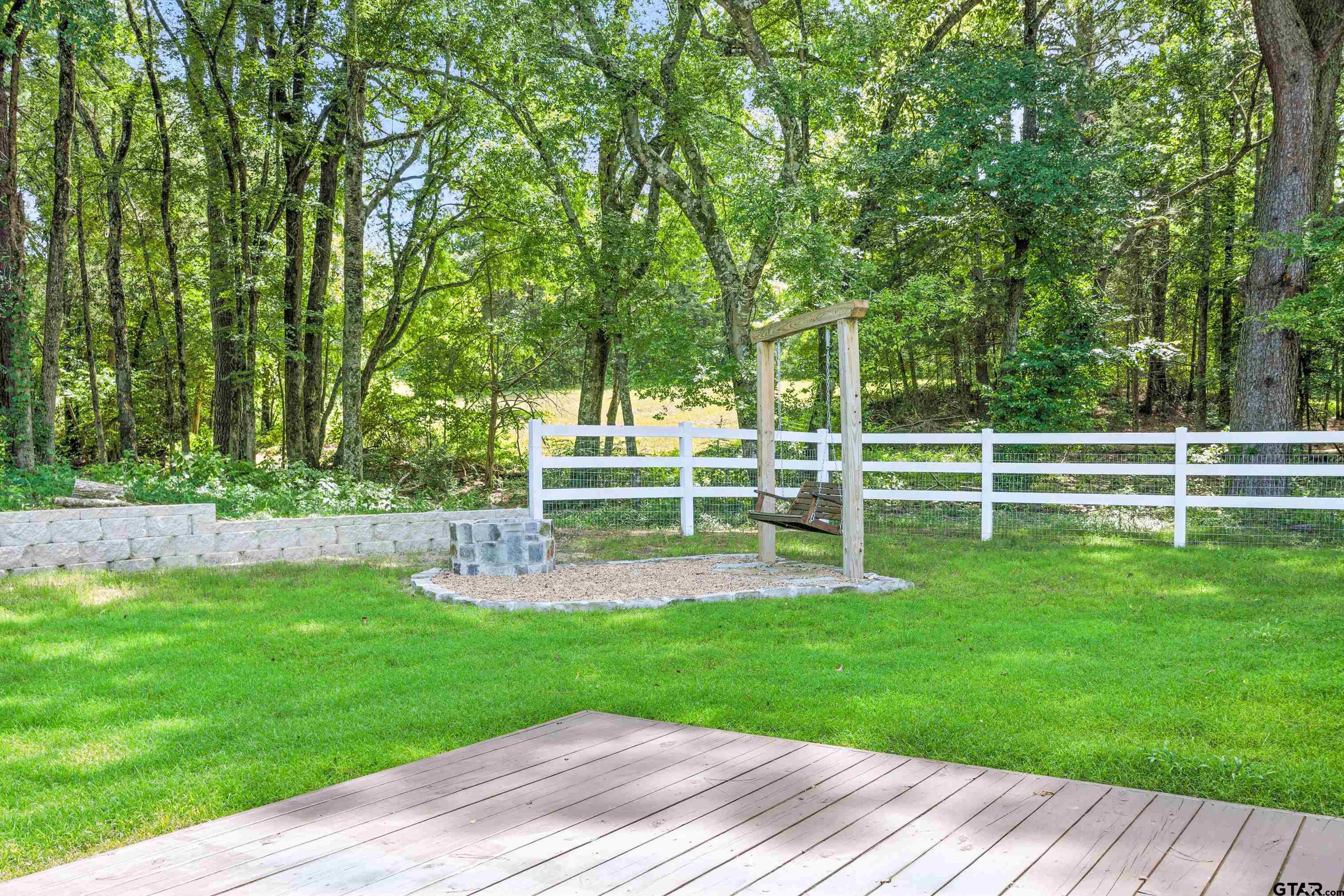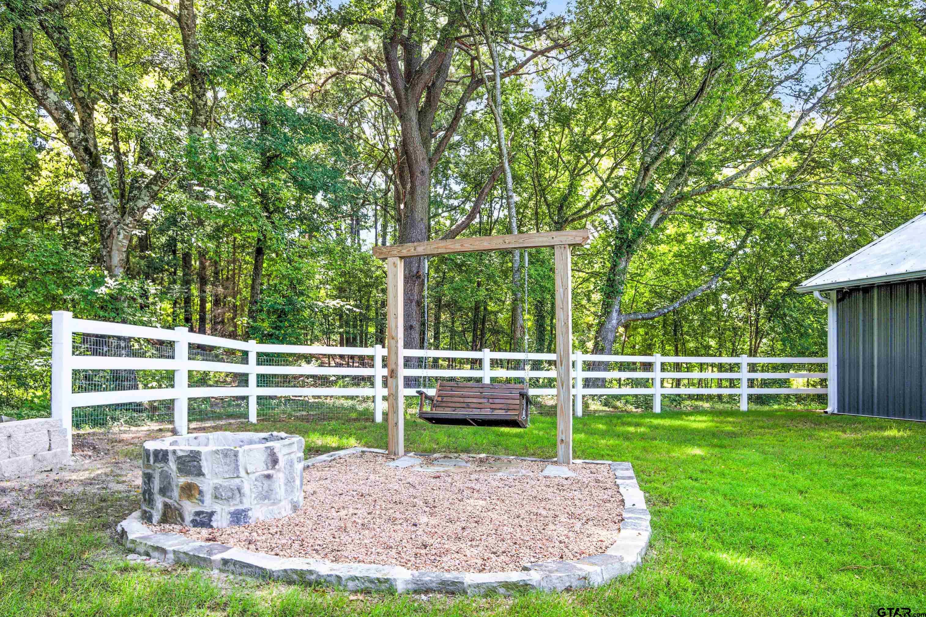 | Super cozy barndominium on 4.89 acres. Single-story 2BR + 2BA home with attached 2-car garage, and 1,200 SF interior. Located in Star Mountain Ranch with paved roads, utilities, and community amenities. Open-concept living room, dining area, and kitchen with stainless steel appliances, granite counters, tile backsplash, crown molding, recessed lighting, and ceiling fans. Primary suite includes a walk-in closet, double vanity bath, and direct access to the rear deck. Additional features include pantry, laundry room, internet availability, central electric HVAC, and security system. Exterior offers a metal roof, metal siding, slab foundation, covered front porch with timber columns, open back deck, fenced yard section with fire pit and swing, and automatic gated concrete drive. Acreage includes a mix of pasture and mature trees with private homesite set back from road. The back section of the property is level and suitable for erecting a barn, workshop or office having direct access to Hwy 757. Community anchors include Interstate access within 3–6 miles, UT Health North Campus Tyler - 6 miles, Stillwater RV Resort nearby, Winona Coffee - 0.5 miles, and Winona ISD - 0.8 miles. | |