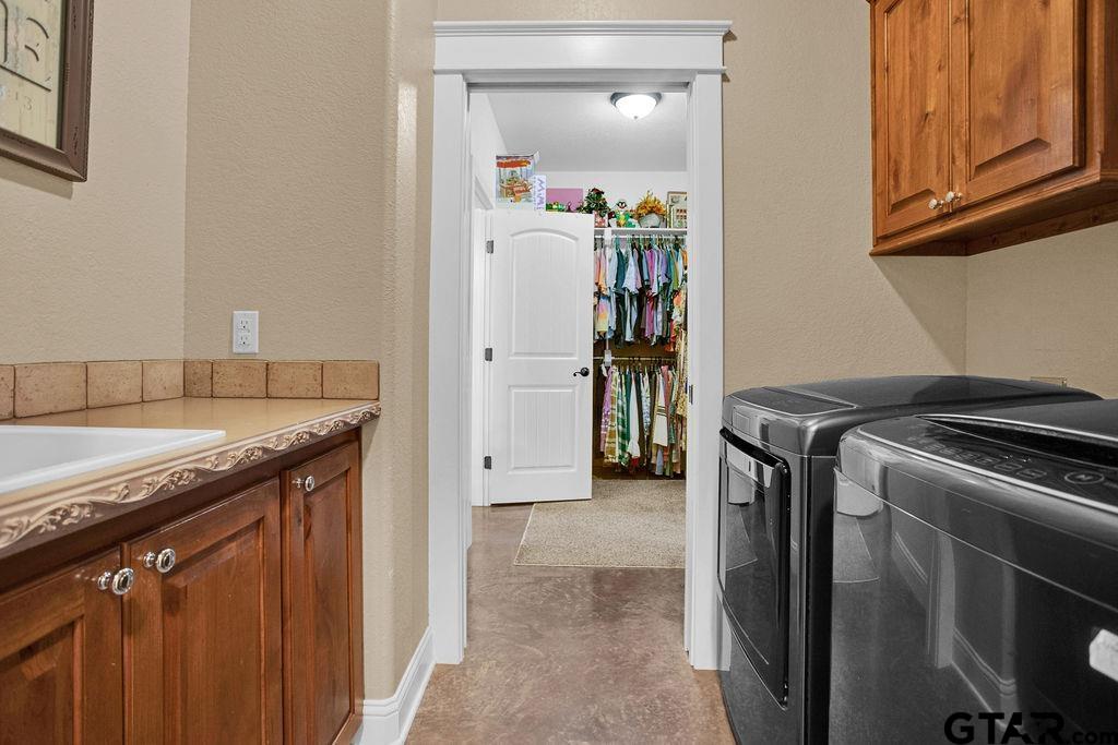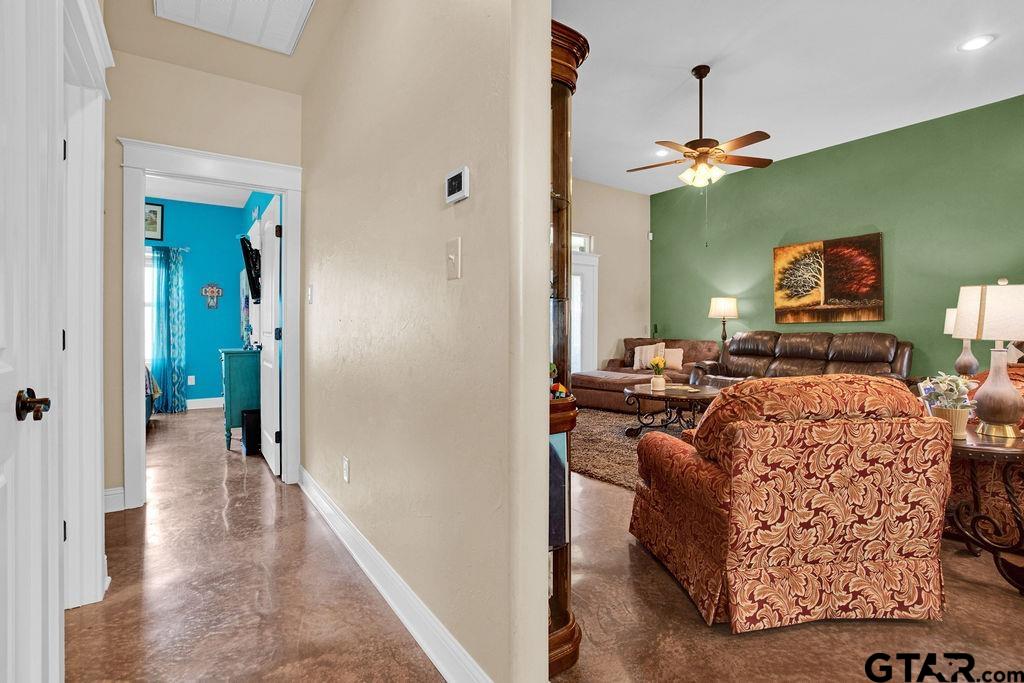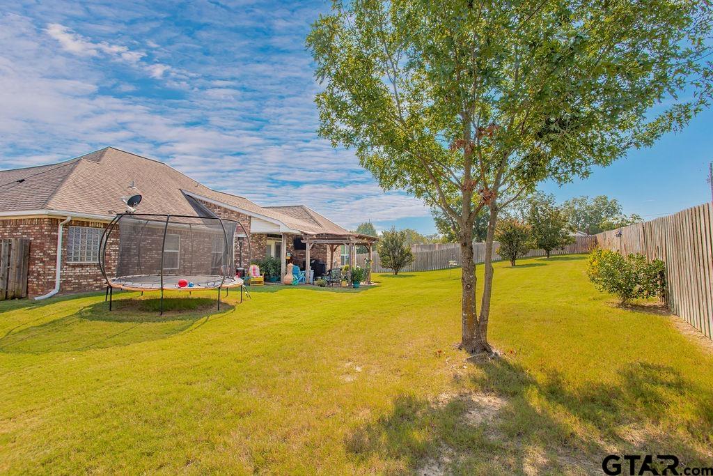 | Beautiful three bedroom, two bath home in the Ruby Trails Subdivision. Convenient to all Lindale schools, shopping, restaurants and community activities. High ceilings make this 2048 sq ft floor plan feel even larger. Open flowing floor plan is excellent for both day to day living and entertaining. Large split master suite with trayed ceiling. Separate jetted garden tub and shower and huge walk in closet. The master closet flows into the laundry room area for ease of use. The secondary bedrooms are situated on the opposite side of the home and share and full bath with shower/tub combo. Large living area with gas fireplace. Stained concrete floors throughout. Large and relaxing backyard area with covered patio for entertaining. 2 car garage. Very "family friendly" home design. One owner home! Tankless water heater, custom counters | |
