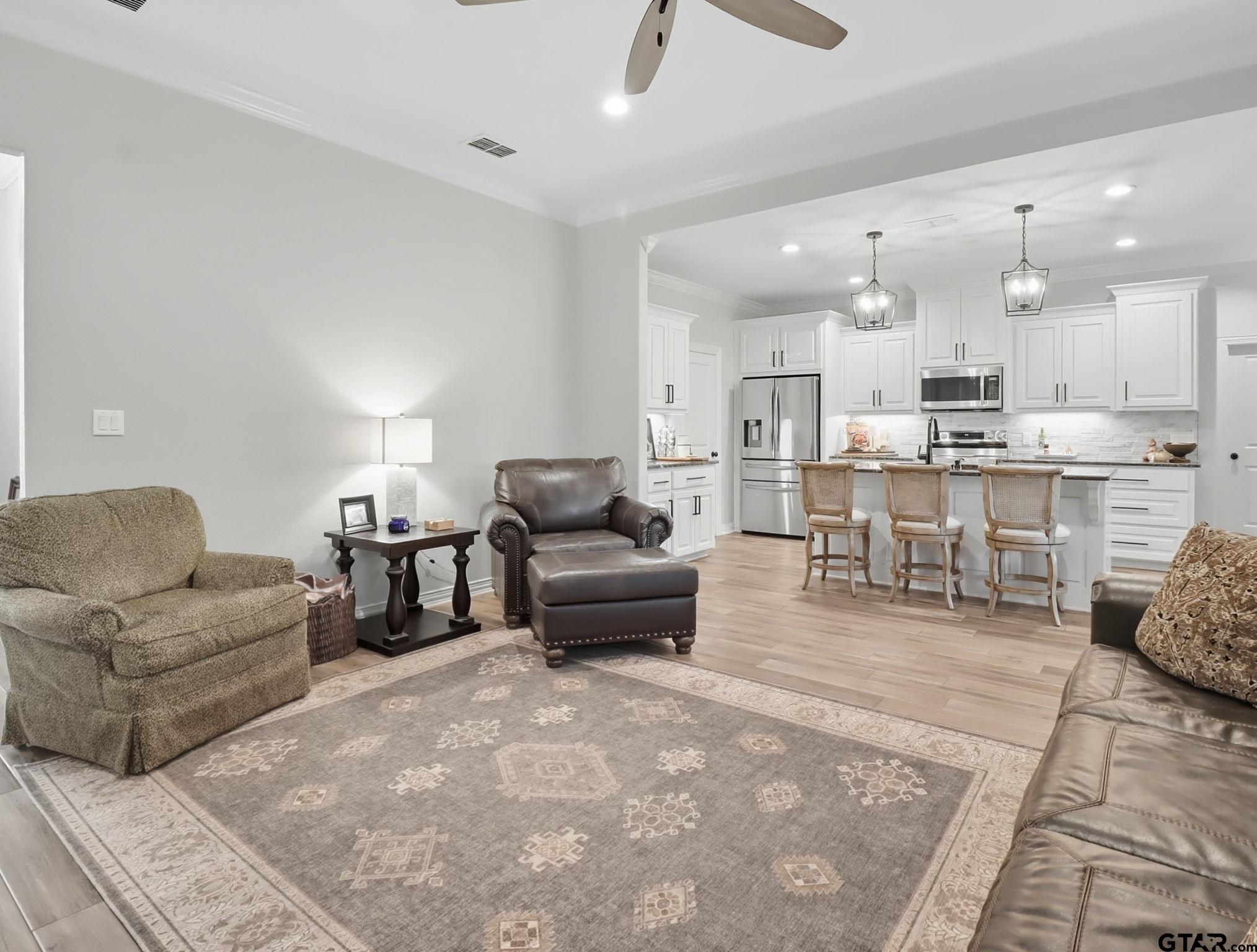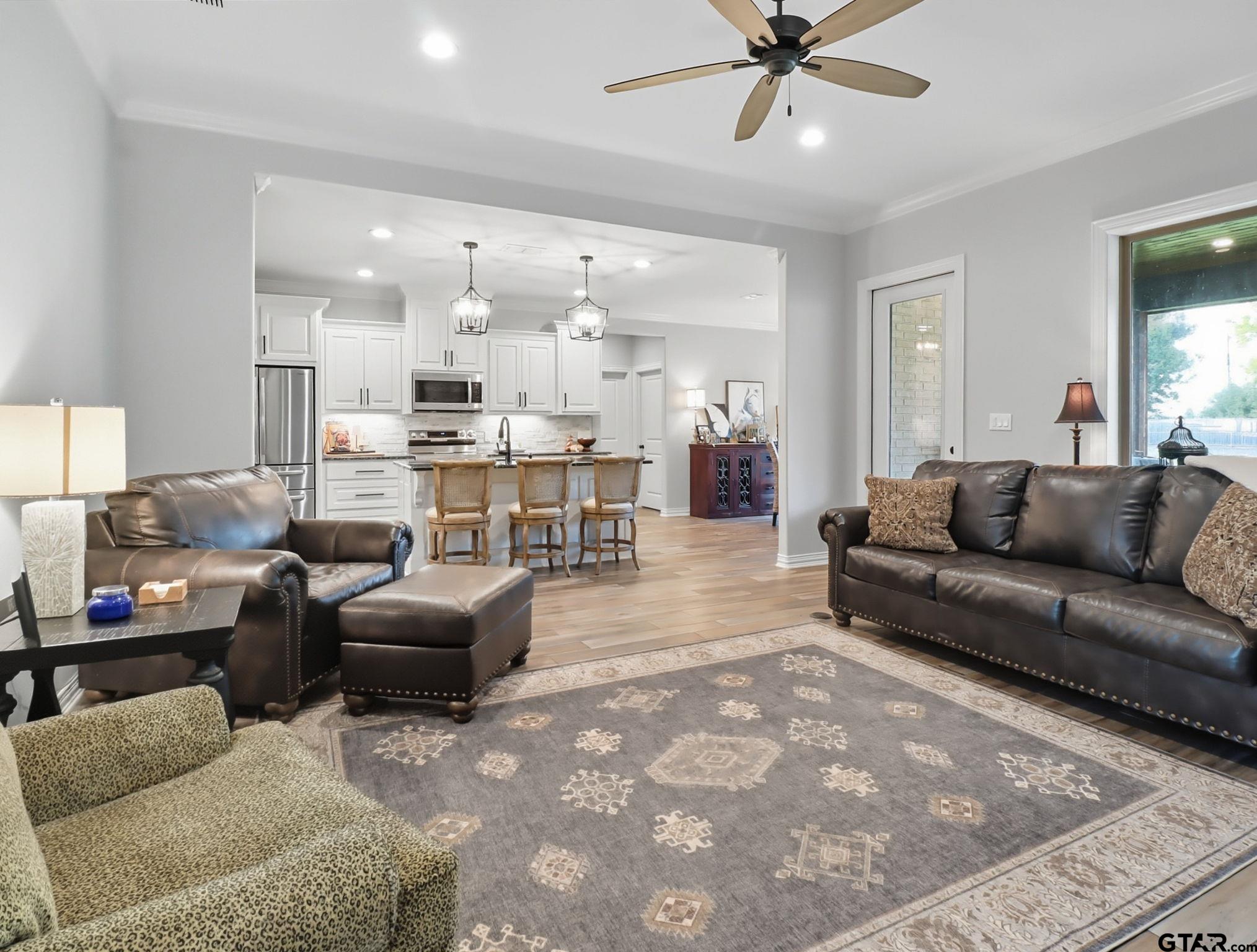 | Gorgeous, like-new 4BR/2BA home in Kilgore with an open-concept floor plan that blends the living, dining, and kitchen. Living room offers a cozy fireplace and large windows for natural light. The kitchen shines with stainless appliances, large island, and an oversized walk-in pantry for amazing storage. The primary suite is a retreat with soaking tub, walk-in shower, dual sinks, and large walk-in closet. The oversized laundry room provides extra space for folding, organizing, and storage. Enjoy the fabulous covered back porch with wood ceiling overlooking the large fenced backyard—perfect for pets, play, or entertaining. Even better, the slab is already poured for a shop with half bath and porch space—ideal for future storage, workshop, or poolside cabana. Power Outages are No Problem here with a whole-house Generac generator you'll be grateful for. All this and more in the charming Windsor Park neighborhood on the outskirts of town. | |