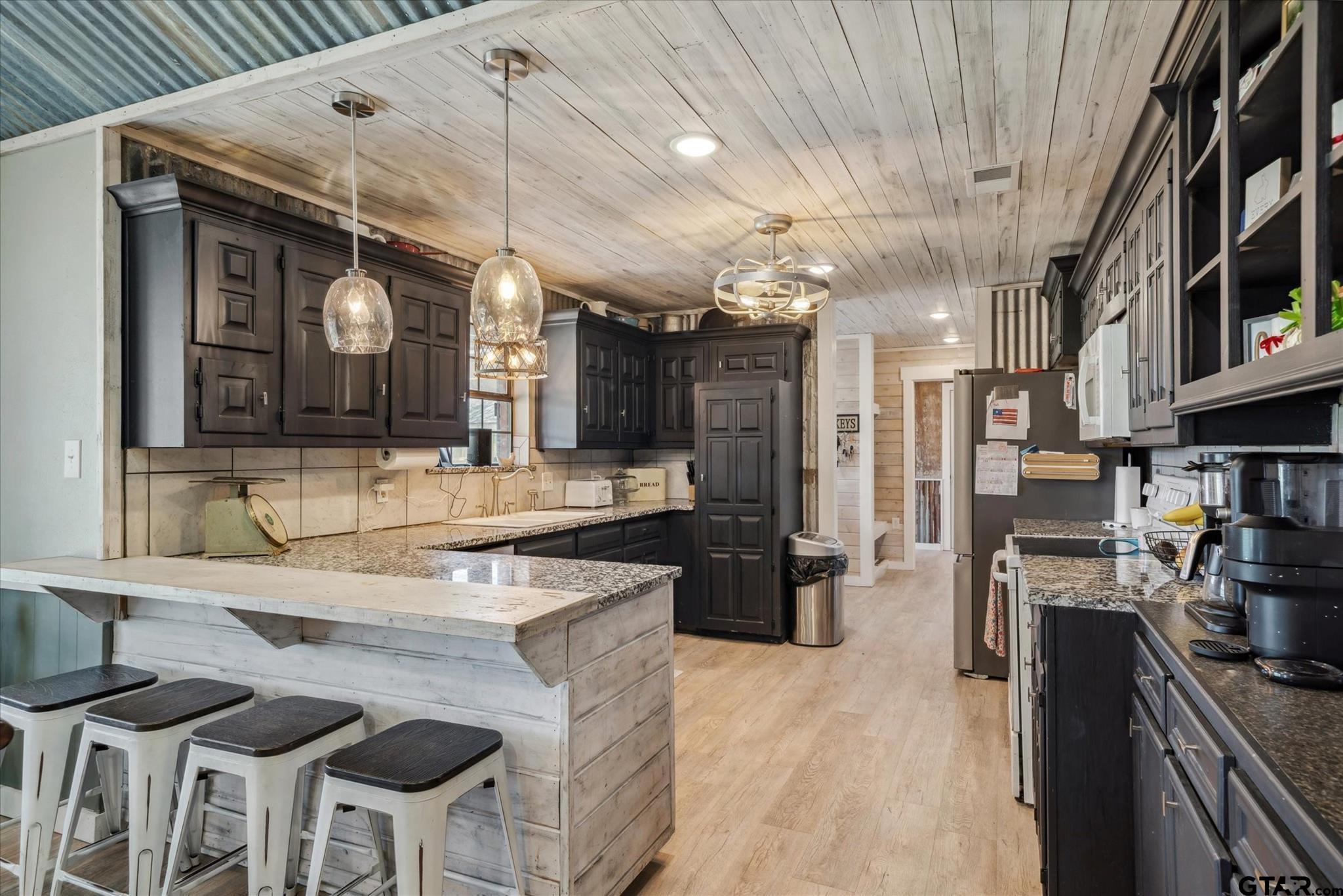 | This charming four-bedroom home combines custom touches with comfort, offering a warm and inviting atmosphere. The open-plan living area features soaring vaulted ceilings and a cozy wood-burning fireplace, perfect for family gatherings. The kitchen showcases beautiful granite countertops and freshly painted cabinets, blending elegance and practicality. The master suite is a private retreat with vaulted ceilings, a large walk-in closet, a make-up area, and an attached bathroom. Three additional well-sized bedrooms offer space for family, guests, or a home office. Off the living room, a versatile flex space is ideal for any use, while a built-in desk area provides a quiet spot for working from home. The dining area, also with vaulted ceilings, adds to the home's open, comfortable feel. An oversized carport offers ample parking, and the fully enclosed yard ensures privacy. The oversized backyard is perfect for outdoor living. A large workshop with a carport overhang offers equipment storage or additional parking. Plus, easy access to the street behind through a double gate leads directly to the shop. While most of the garage area has been enclosed for additional living space, a portion remains for motorcycle or lawn equipment storage, along with a workbench. With custom design touches, vaulted ceilings, and cozy comfort, this home offers both warmth and functionality. It’s the perfect place to relax, entertain, and create lasting memories. | |